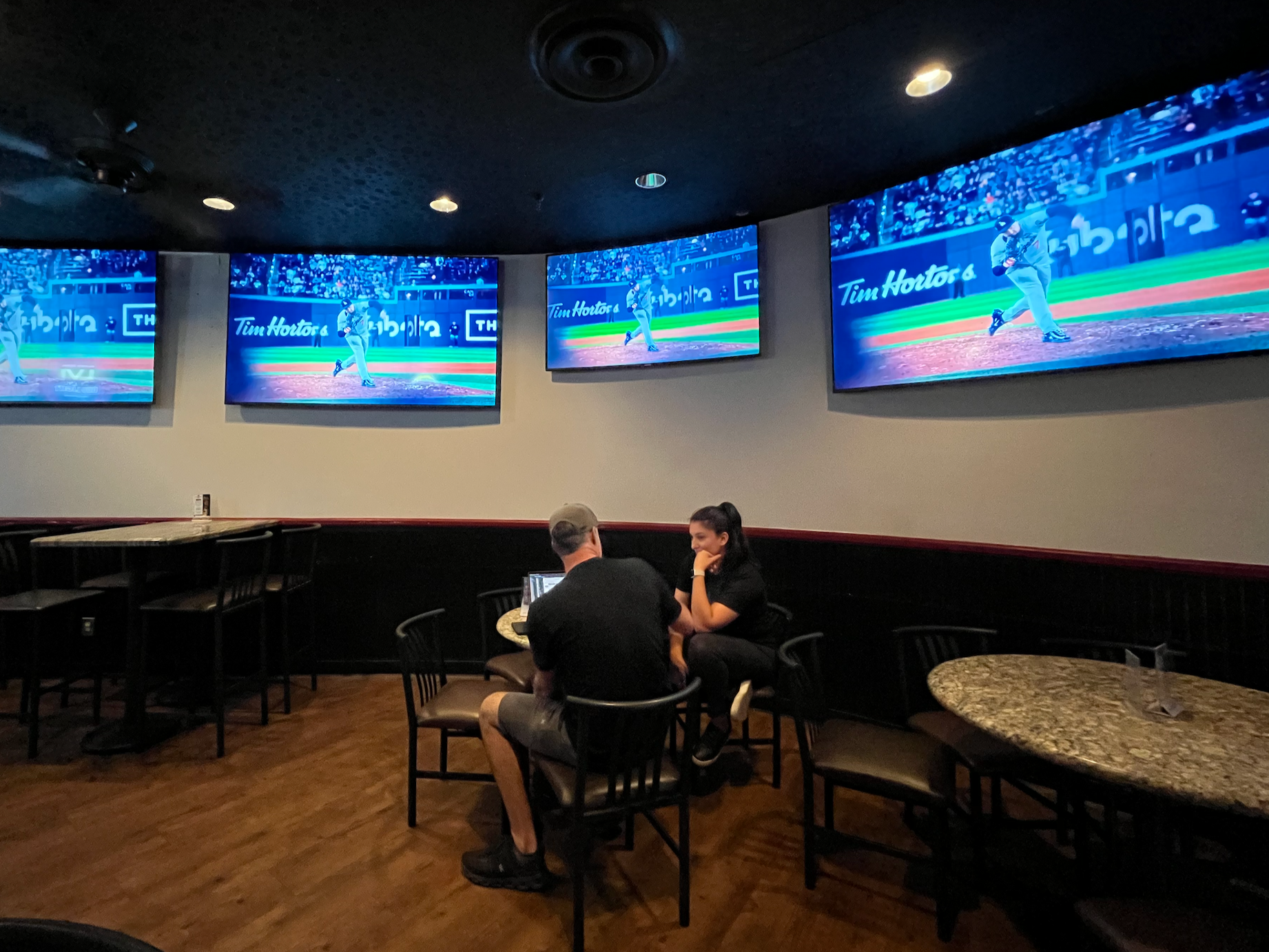 Audio is powered by Theory's professional in-ceiling speakers — powerful, discreet, and capable of being split independently per zone. We integrated their existing jukebox player into the new system, so the jukebox can play in one area while a completely different audio source plays in another. Everything is controlled through QSys with a simple, custom user interface. We trained the full staff before launch, and the new sports bar setup is already generating increased revenue.